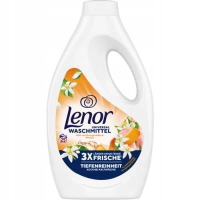 Lenor Universal Orangen Pfirsich Gel 25p 1,25L to płyn przeznaczony do prania bielizny.  Dzięki specjalnej formule skutecznie usuwa plamy i brud, pozostawiając tkaniny czyste i pachnące. Płynna postać ułatwia dawkowanie i aplikację. Produkt jest idealny do prania białych ubrań.